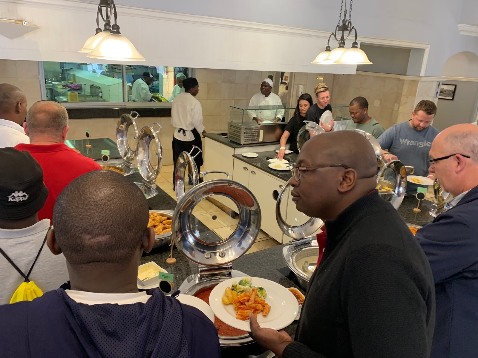 The buffet consist of a typical Tsogo Sun Lunch Buffet with of Lamb Curry or a Beef Stew, Fried Hake or other Seafood, Roast Chicken, Rice, Pasta, Sauces, Assorted Veggies, Baby Potatoes, a table with Assorted Cheese & Salads, and a Desert Table with Malva Pudding and Custard, and Assorted Desserts. This menu is not cast and stone, and may vary from day to day. Halaal Meals are ordered from Barcelos on arrival (011 248 6907). Vegetarian and Vegan dish from the buffet.